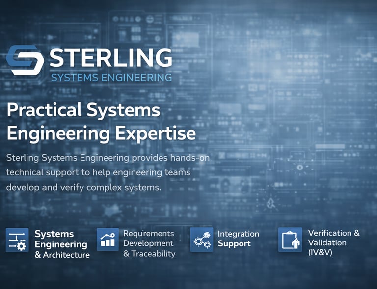 Sterling Systems Engineering provides hands-on systems engineering support for complex engineering programs. Our services focus on strengthening technical execution across the system lifecycle, from early requirements development through integration, analysis, and verification. We work closely with engineering teams to reduce risk, improve traceability, and ensure systems are delivered with clarity, rigor, and confidence.